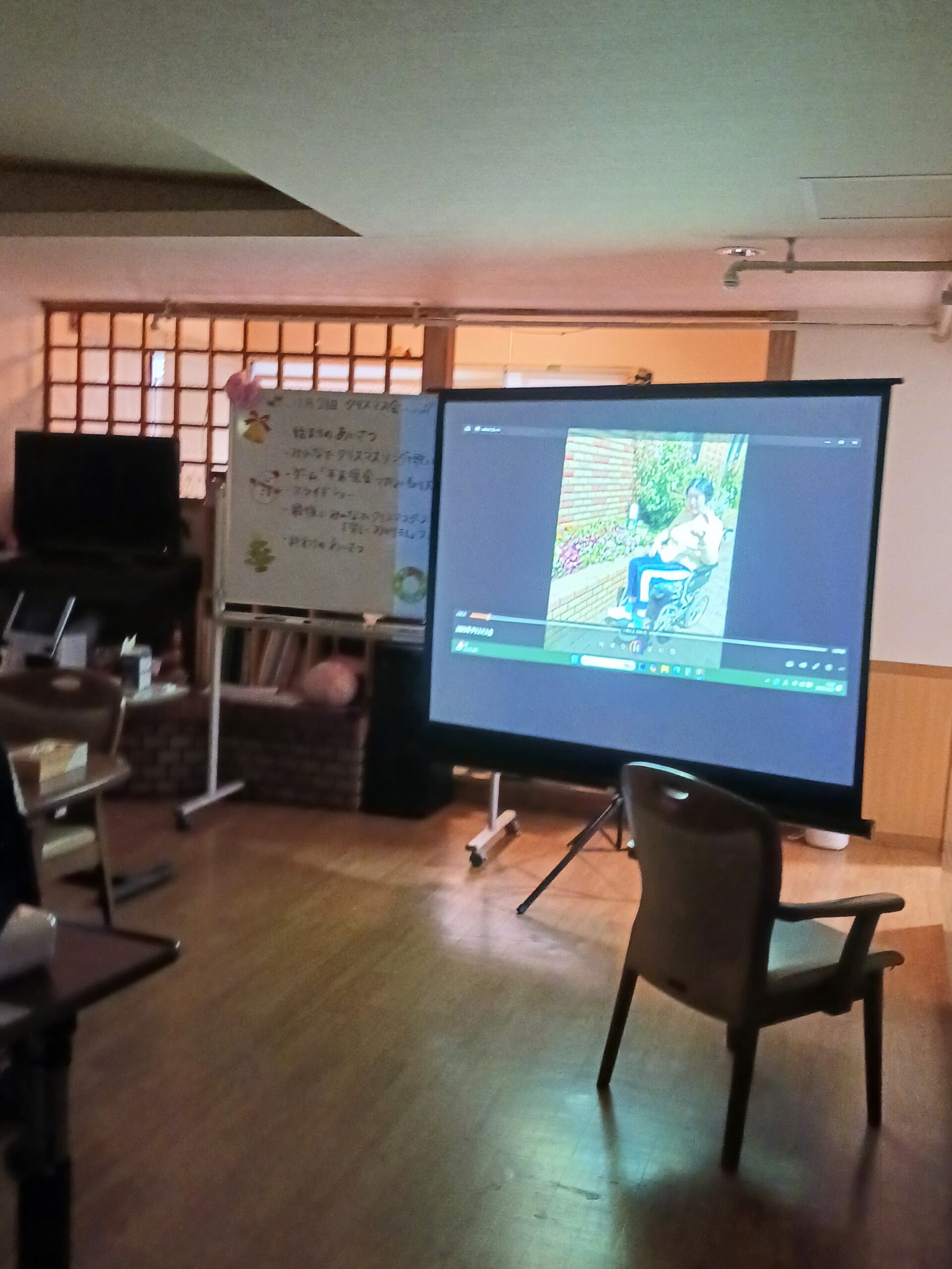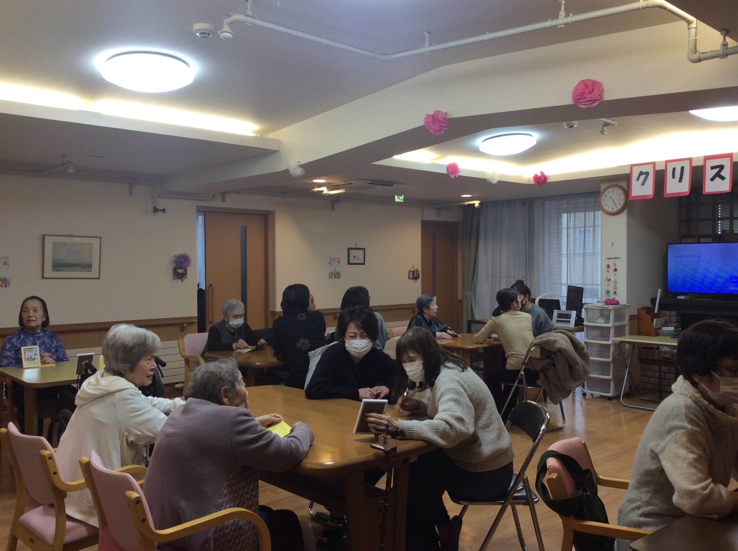 昼食後、1Fリビングの会場に集まりクリスマス会スタートです!