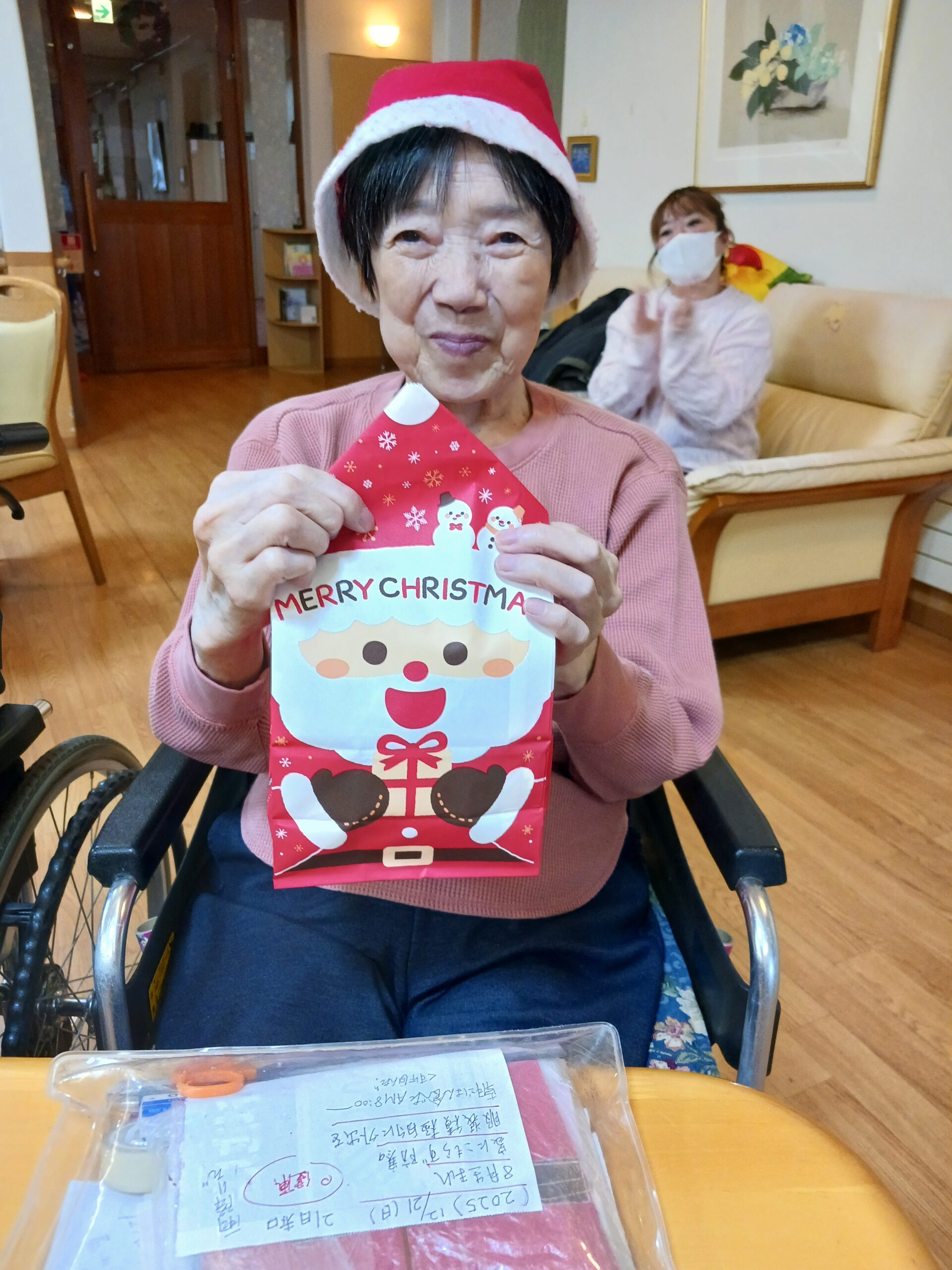 利用者様もサンタ帽子でパシャリ!プレゼントの記念品とカードと共に。