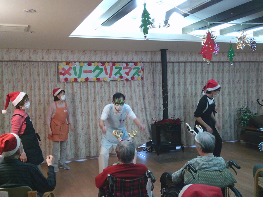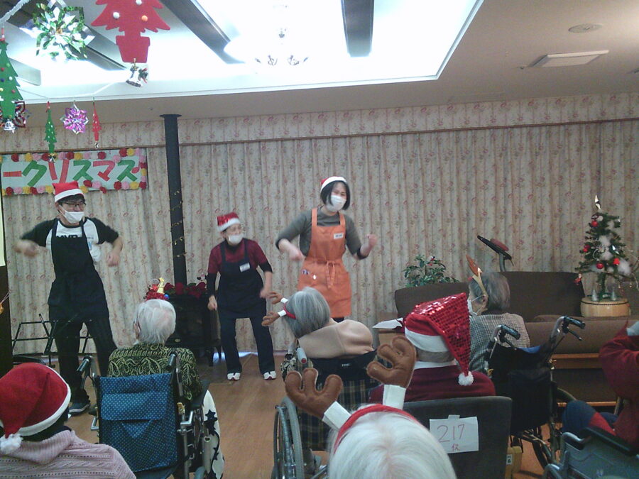 3つ目は「ジングルベル」の曲に合わせて職員が踊り、それに合わせてみんなで踊りました。(^^♪