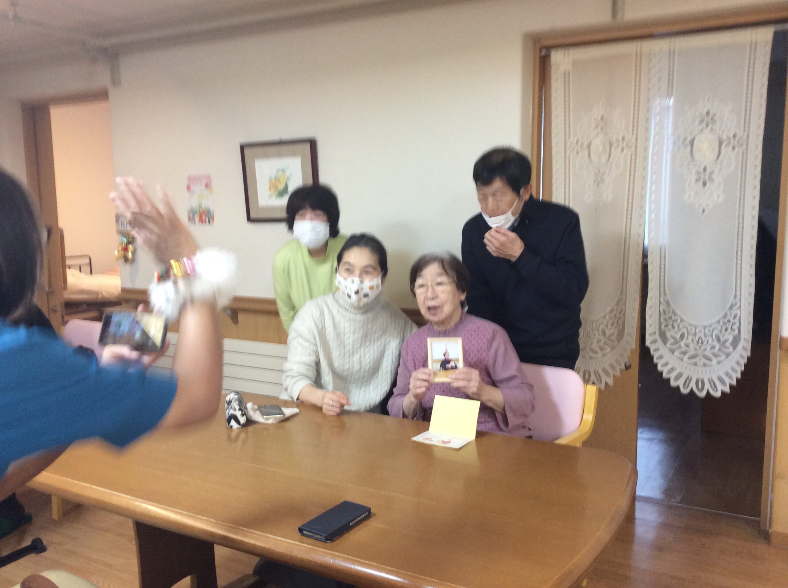 普段なかなか会えない、ご家族様と一緒に撮影。職員が見切れているのはご愛敬。閉会後には、家族様と過ごす時間を取らせて頂いています。