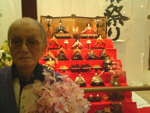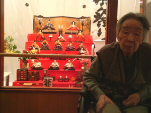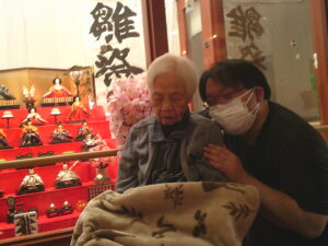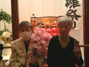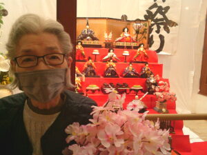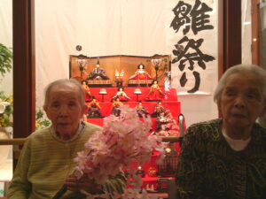 ひな壇の前でご入居者様と記念撮影をしたのでその様子を見ていただきたいと思います。